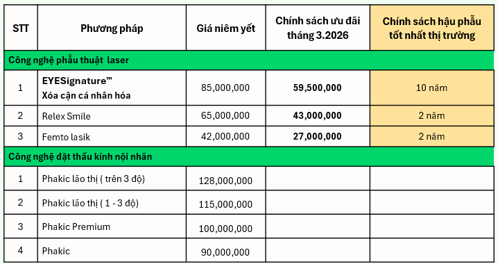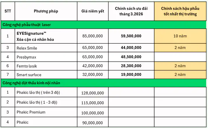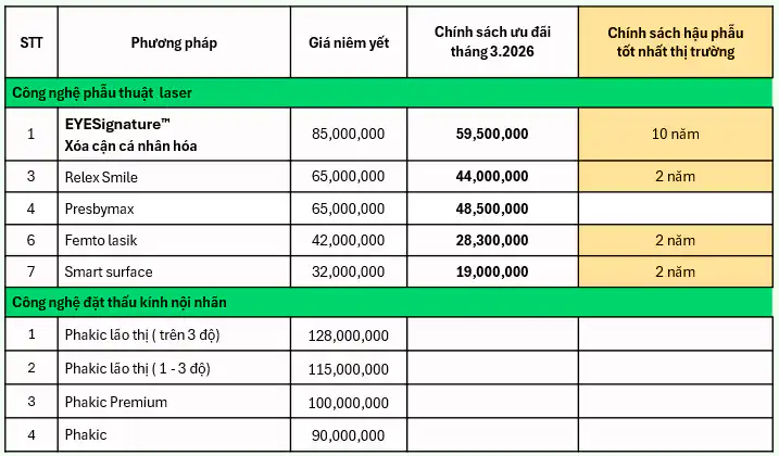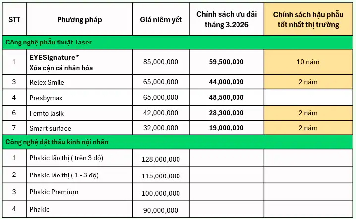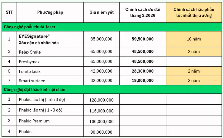 - Hạn mức đặt cọc: là 3.000.000vnd áp dụng với tất cả các phương pháp (trừ phương pháp Phakic) và mức giá tại thời điểm đặt cọc sẽ được bảo lưu đến ngày 31/03/2026 kể từ ngày đặt cọc.