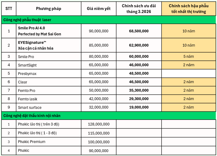 - Đặc biệt từ ngày 1/3 – 8/3 sẽ có ưu đãi lớn áp dụng cho tất cả khách hàng (không phân biệt thời điểm khám) dành riêng cho 3 phương pháp Smile Pro Ai 4.0, EYESignature, Smile Pro như sau: