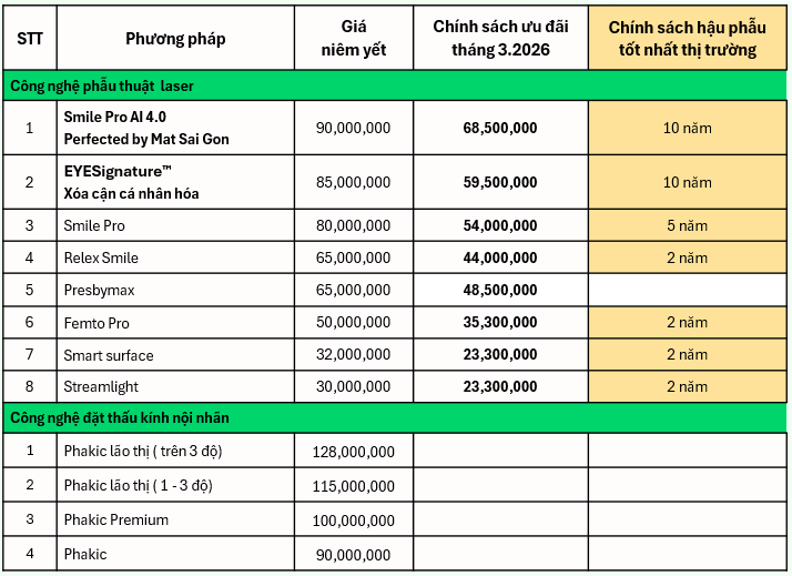Hệ thống Mắt Sài Gòn trân trọng thông báo các ưu đãi dành cho khách hàng có nhu cầu phẫu thuật khúc xạ trong tháng 03/2026, với những ưu đãi cụ thể như sau: